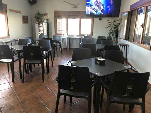 La distribución física del local se organiza en varios espacios. El interior cuenta con zonas de amplitud considerable. Junto a la barra principal, hay un área que alberga cinco mesas bajas. En este mismo espacio interior se han dispuesto un futbolín y un juego de dardos.