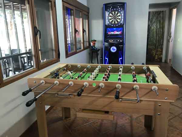 - Interior: Espacios amplios, barra, área con cinco mesas bajas, futbolín y juego de dardos.