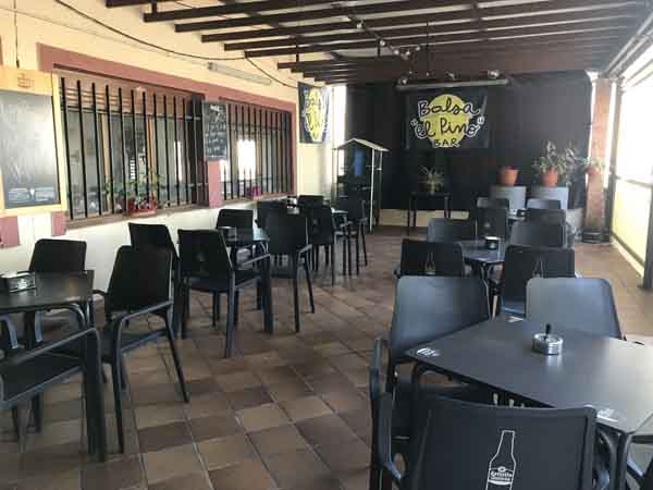 El BAR BALSA EL PINO cuenta también con zonas exteriores. Existe una terraza que se encuentra cubierta, en la que hay dieciséis mesas. Adicionalmente, hay una terraza exterior que es de carácter ajardinado y de dimensiones muy amplias, equipada con quince mesas. La descripción general del ambiente del local utiliza los términos acogedor, amplio y funcional.