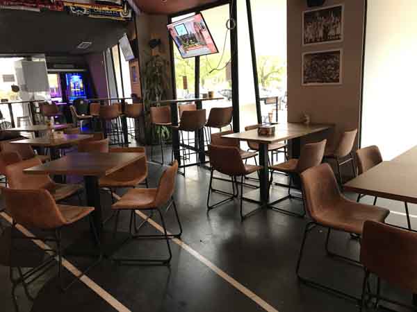La distribución física del local se organiza en varias áreas. En el interior, el espacio principal cuenta con una barra de servicio. Adyacente a la barra, se dispone una zona con diez mesas de altura baja, destinadas a clientes que prefieren consumir sentados. Complementando el aforo interior, el bar tiene una terraza exterior equipada con seis mesas. Esta configuración permite diferentes opciones de estancia para los clientes.