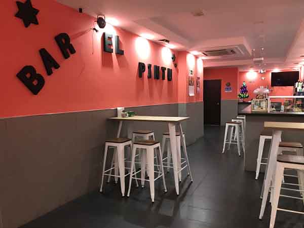 El espacio interior del BAR EL PINTU cuenta con una distribución definida. En la zona de acceso principal se localiza una barra, diseñada para el servicio de bebidas y el consumo de tapas. Tras esta área, el local se extiende hacia un espacio posterior. En esta segunda zona se encuentran tres mesas altas de dimensiones considerables, destinadas a grupos de comensales. Este ámbito también dispone de elementos de ocio, concretamente un futbolín y una diana para el juego de dardos.