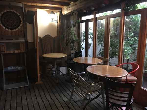 El local presenta una distribución interior segmentada en varias áreas. En la entrada principal se localiza una barra longitudinal. En este espacio se sirven consumiciones y se ofrece un servicio de tapeo. Adyacente a la barra, se dispone una zona con sofás y mesas bajas. Continuando hacia el interior, existe una estancia privada que alberga una mesa de billar para uso de la clientela. El establecimiento cuenta también con un patio interior y una terraza en la parte exterior. En la terraza se han instalado seis mesas bajas.