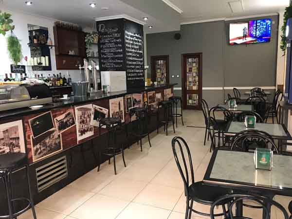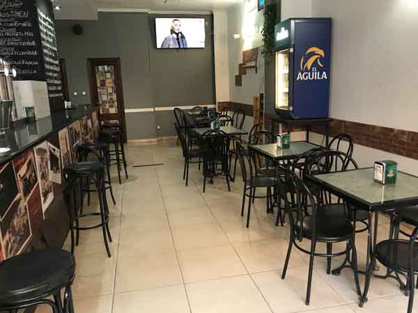 El espacio interior del local está distribuido en una única sala principal. En esta sala se han dispuesto cinco mesas de altura estándar, con capacidad para un número variable de comensales. Las mesas están acompañadas por sillas. La decoración incorpora elementos que se encuentran comúnmente en establecimientos de hostelería. La iluminación proviene de fuentes de luz artificial situadas en el techo y de la luz natural que entra por el frente del local.