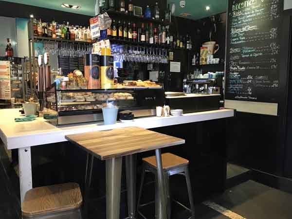 La terraza, con sus dieciocho mesas, supone un espacio adicional al interior. Este espacio se utiliza según las condiciones meteorológicas y la temporada. La barra interior actúa como el punto focal del local, donde se exhibe una parte significativa de la oferta de comida.