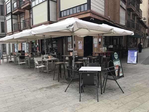 La distribución física del local presenta una barra central. Sobre esta barra se disponen tapas y raciones disponibles para los clientes. Además, el local cuenta con una terraza exterior. En esta terraza hay dispuestas dieciocho mesas para su uso.