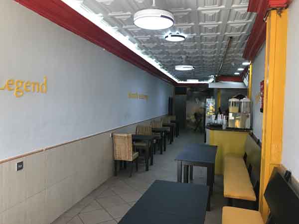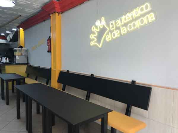 La distribución del espacio interior cuenta con un comedor principal. Este comedor está equipado con mobiliario específico. Las mesas instaladas son de altura baja. Para el acomodo de los clientes, se han dispuesto bancos corridos, que son asientos largos sin separación individual entre unos y otros, adosados a las paredes o dispuestos de forma independiente. Esta configuración define la organización del área destinada al consumo en el lugar.