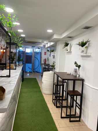 El ambiente dentro del local se define como acogedor y funcional. El espacio está distribuido para crear un entorno distendido, donde los comensales pueden permanecer en un marco agradable. La disposición del mobiliario incluye un área interior con mesas altas. Adicionalmente, el local cuenta con un espacio exterior, una terraza, que está equipada con siete mesas. Esta terraza se encuentra situada junto a la fachada del edificio de la catedral.
