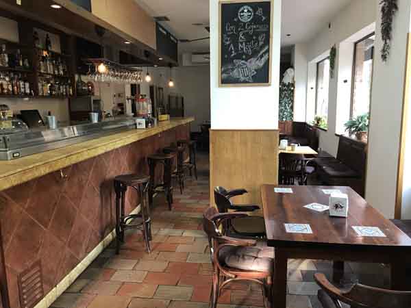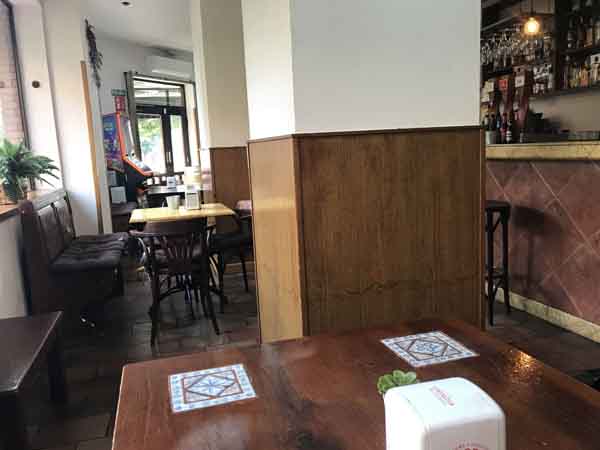 El espacio interior del local se distribuye en varias áreas diferenciadas. Al acceder, se encuentra una barra de servicio de dimensiones amplias. En esta zona se sirve un tapeo que consiste en una variedad de aperitivos y pequeñas raciones. Tras la barra, el salón principal cuenta con un espacio interior en el que se han dispuesto un total de siete mesas. Estas mesas están acompañadas por sus correspondientes sillas y pueden configurarse para grupos de distintos tamaños. Además, el local posee un área exterior. Se trata de una terraza en la que se han instalado ocho mesas catalogadas como bajas, acompañadas de sillas o taburetes. La terraza se encuentra en la vía pública, frente al acceso principal.
