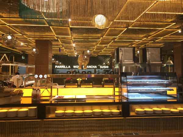 Dentro del buffet, existen varias especialidades diferenciadas. Una de ellas está dedicada a los mariscos, que se presentan en diversas preparaciones. Otra sección destacada es la de sushi, que incluye piezas basadas en arroz, algas, pescado y vegetales. Además, el local cuenta con una parrilla, donde se cocinan al calor directo carnes, pescados y en ocasiones vegetales, según disponibilidad.