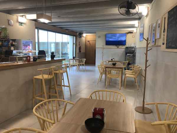 La disposición del mobiliario, con mesas bajas en el interior y una terraza numerosa en el exterior, define los espacios disponibles para el consumo. El número total de mesas, veintisiete en temporada de terraza y siete en el interior, indica la escala del local.