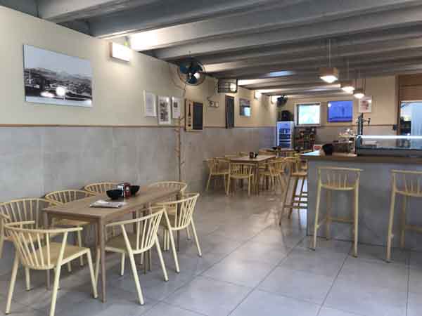 La distribución física del local comprende un espacio interior y una zona exterior. En el interior, la sala está rodeada por siete mesas bajas. Durante los meses de verano, el establecimiento dispone de una terraza exterior equipada con veinte mesas. Esta configuración determina la capacidad de alojamiento de clientes.